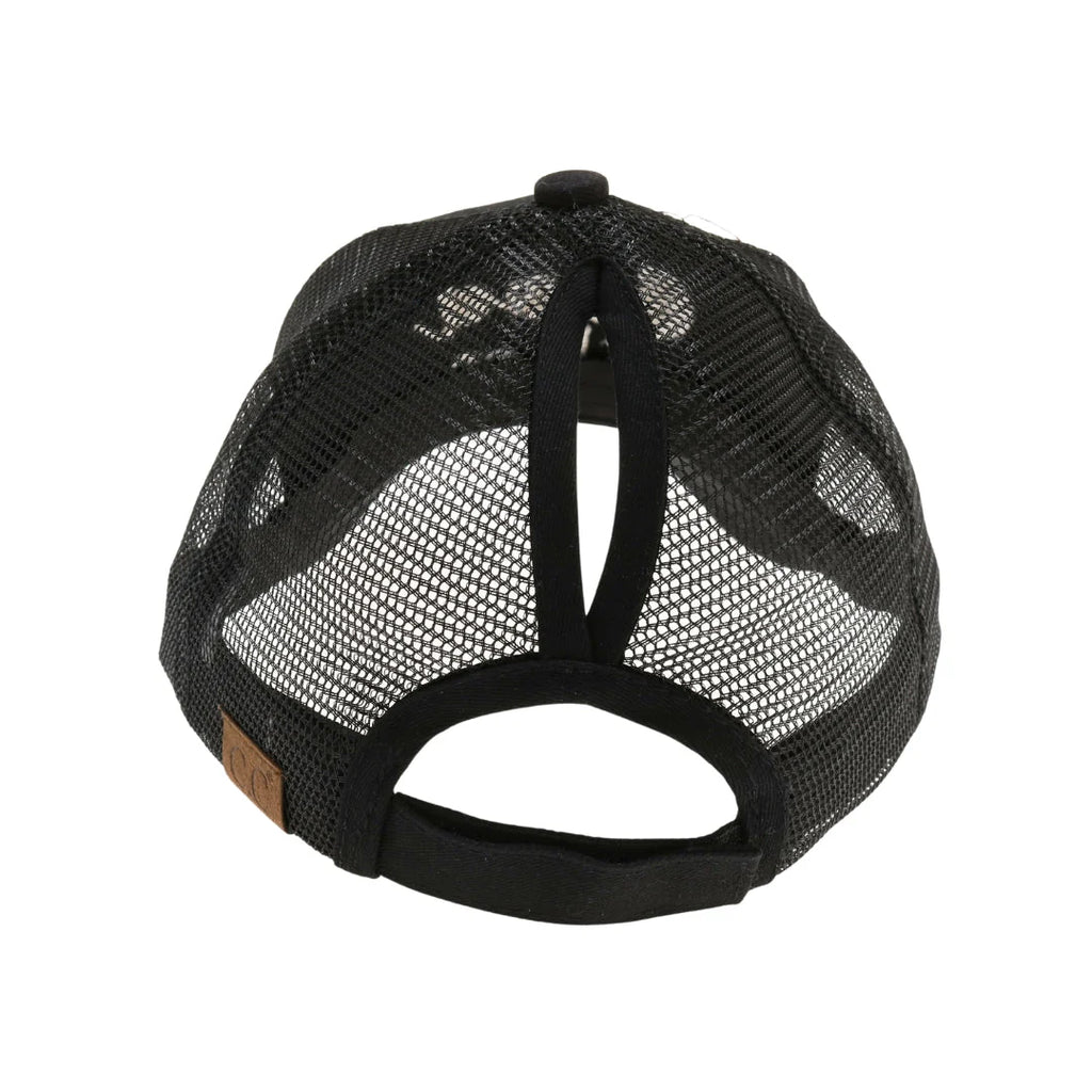 Say what you really mean with these color changing embroidered mesh back high ponytail ball caps from CC Beanie. Writing changes from white to pink in sunlight.